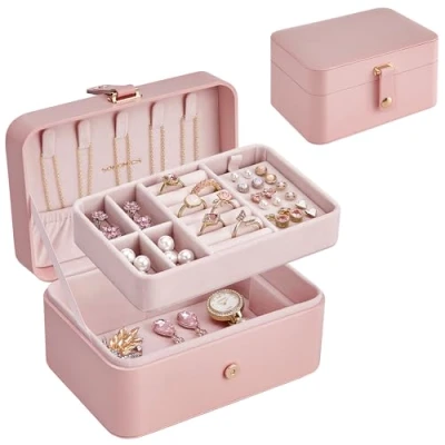 SONGMICS Jewellery Box, 2 Layer Storage, 11 x 16 8 cm Travel Portable Case, Small, Spacious, for Larger Accessories, Gift Idea, Jelly Pink JBC166R01