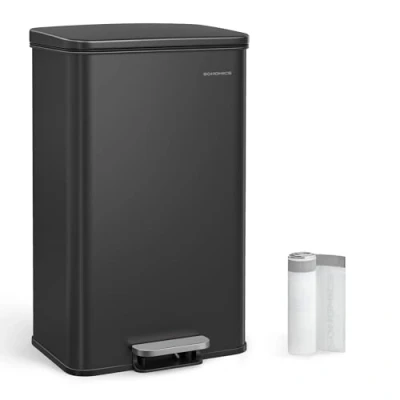 [Soft Closure] The kitchen bin features a slow, silent, and soft-close lid. No more dealing with loud clangs after use—enjoy a quieter and smoother disposal experience [Quality Steel] Made of quality steel, the 40L rubbish bin is rust-resistant for long-term use and easy to clean with a damp cloth to keep it free from marks [Stay-Open Lid] For larger clean-ups, the lid can be manually opened to a catch point and will stay open, allowing for easy trash disposal. To close, simply push it down by hand [Bag Retainer Ring] This pedal bin has a bag retainer ring instead of a clumsy, space-wasting bucket, making it effortless to secure the bag in place and out of sight while offering 20% extra interior space for trash [15 Liner Bags Included] This kitchen bin includes 15 rubbish bags (code 050A) that’s designed for a perfect fit, enabling immediate use after unpacking