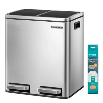 Modern Elegance: With its clean lines and sleek silhouette, this rubbish bin brings a modern touch that enhances your kitchen’s look Effortless Sorting, Hands-Free Opening: Featuring two 15 L compartments, this pedal bin (measuring 41.8 x 35.9 x 44.5 cm) lets you separate recycling and waste easily, all without touching the lid Soft Close: The built-in buffer mechanism of the recycling bin ensures the lids close softly and quietly, reducing loud clangs while keeping odours under control Removable Inner Buckets: This kitchen bin includes 2 inner buckets with handles for easy emptying and cleaning—especially if a bag leaks or spills Includes 15 Bin Bags: To get you started, 15 bin bags are included so the rubbish bin is ready to use upon delivery