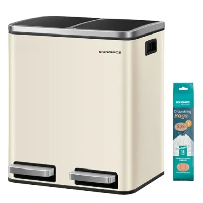 SONGMICS Kitchen Bin, 2 x 15L Double Bin for Recycling and Waste, Pedal with Dual Compartments, Inner Buckets, Soft Close Lids Small Families, Steel, Sand Beige Ink Black LTB30A02