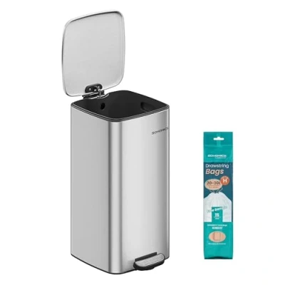 【EFFICIENTLY COMPACT】This kitchen bin, with its rectangular opening, offers a 30 L capacity within a compact footprint, enhancing space utilisation in your kitchen 【ENHANCED STABILITY】This rubbish bin is equipped with non-slip pads at the base to enhance its stability, deterring pets from knocking it over and helping to keep your space tidy 【CHIC AND EASY-CLEANING】Featuring a steel body, this modern waste bin not only easily blends into your kitchen decor, but is also rust-resistant and easy to clean, maintaining its sleek appearance over time 【CLOSES SOFTLY & STAYS OPEN】The lid of this pedal bin is designed for a quiet, slow close. It can also stay open for longer tasks by lifting it to 90°, making waste disposal more convenient 【PRACTICAL INNER BUCKET】Experience a tidy, hassle-free disposal with this garbage bin's inner bucket. It features side handles for easy removal and a bag securing hole to simplify bag changes and keep the bag in place