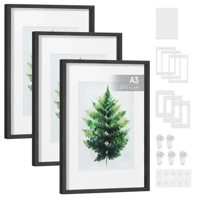 SONGMICS Picture Frames, Set of 3 Photo Frames for A3, A4, 11x14 Pictures, with Mats, Gallery Wall or Table, Art Display, Glass, MDF, 43.4 x 31.1 cm, Ash Black RPF064B01