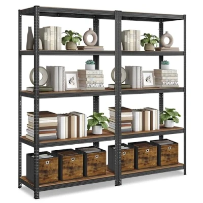 [Sturdy Structure] Sturdy particleboard shelves are supported by the steel frame with additional reinforcement bars, each shelf can hold up to 175 kg, and safely support paints, tools, and fitness equipment [Rustic Look] The shelves of the shelving unit are finished with rustic brown wood grain, adding a stylish effect to any space so you can say goodbye to the boring look [Divided into 2 Units] Each shelving unit can be divided into two separate low shelves, one placed in the kitchen as a stand for the oven and microwave, the other in the study for holding books, plants, printer, and more [Adjustable Shelves] The assembly of the storage shelf requires no tools, parts can be connected together with slot-in joints, and the height between shelves can be adjusted for flexible storage [Anti-Tip Kit] The included anti-tip kit helps you fix the shelf to the wall so that the shelving is more stable for safe use