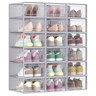 [Kick Mess to the Curb] If your home is slowly but surely becoming a mess of shoes, why not organise them in this pack of 18 classic shoe boxes with transparent body and front door? See your whole collection in order [Keep It Clear] You don’t have to take out and dig through your shoe boxes to look for your commuting shoes every morning, the clear body with transparent front door gives you a glimpse inside your tower of kicks with a grab-and-dash ease [A Snap to Set Up] Simply slot the front, back, and body together and you’ll have these shoe organisers with an inner size of 31.2 x 22.5 x 13.5 cm for max. UK size 11; each pair of sneakers, heels, or flats will have a place of its own [Stack ’Em Up] If you want to store the boxes in an organised way, the corresponding slot design on the top and bottom makes stacking them a snap; ventilation holes let your shoes breathe [What You Get] Pack of 18 transparent shoe boxes with clear front door, stackable and foldable design, ventilation holes. Say goodbye to scattered shoes everywhere and put your shoes in order now!