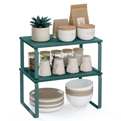 [Additional Ways to Store] These kitchen organiser shelves allow you to keep your cooking essentials, such as spice jars, containers, cans cutlery, and cookbooks all organised and visible. They also double as small food tables for cats [Sturdy and Durable] Made of high-quality engineered wood and metal, each cabinet shelf organisers can hold a maximum weight of 15 kg, so you can store loads of supplies on them [Adjustable] With their unique design, with one slightly smaller than the other, these spice racks can be stacked on top of one another, nested, used separately, or even in an L-shape. Adjust them how you want to perfectly fit your kitchen space [Versatile] They can be used in more than just the kitchen! Use them in the dining room as a way to elevate your table centerpieces, on your bedroom desk to organise your items, or even in your bathroom to neatly store your bathroom essentials [Easy Assembly] These kitchen counter shelves are easy to set up and use due to their simple structure and included instructions
