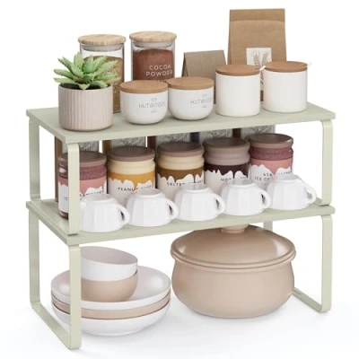 SONGMICS Spice Rack, Set of 2 Cupboard Shelf Organisers, Expandable Kitchen Organiser, Stackable Holder, Metal and Engineered Wood, Summer Sand KCS200K01