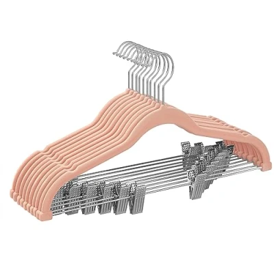 SONGMICS Trouser Hangers, Set of 10 Velvet Hangers with Adjustable Clips, 42.5 cm Long, Non Slip, Space Saving, for Skirts, Coats, Dresses, Light Pink CRF012R10