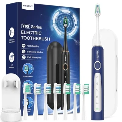 [10x the cleaning power of a manual toothbrush] The electric toothbrush is equipped with a high-frequency motor that generates 50,000 vibrations per minute and effectively removes up to 99.99% of plaque. It not only thoroughly cleans the tooth surfaces but also penetrates between the teeth to remove stubborn food debris. At the same time, it freshens breath and promotes blood circulation in the gums, effectively preventing gum disease. Also suitable for children [Great value for money] The 8 replacement brush heads is designed to 3 different toothbrush head color, making it easy to distinguish each brush head when used by different family members. The included brush heads offer a total service life of 24 months. The sonic toothbrush uses only 100% rounded bristles to protect gums and tooth enamel. W-shaped bristles adapt perfectly to the teeth and thoroughly clean between them [Long 90-day battery life for worry-free travel] After a charging time of just 3.5 hours, the toothbrush can be used for up to 90 days. It only needs to be recharged four times a year. The YTEATH PRO electric toothbrush is perfect for daily use and longer trips [5 Cleaning Modes] The YTEATH PRO electric toothbrush offers various modes tailored to different dental needs, from routine cleaning to the care of sensitive gums. Sensitive mode is especially suitable for users with sensitive teeth and those using a sonic toothbrush for the first time. White mode helps remove surface stains for a whiter smile. Press and hold for 2 seconds to turn off. Restart to restore the last brushing mode [2-minute scientific brushing time]: The electric toothbrush's 2-minute timer is designed according to the brushing time recommended by dentists. It helps you thoroughly clean your teeth and develop proper brushing habits. The 30-second switch indicator reminds users to switch brushing areas to ensure each quadrant is adequately cleaned [Travel-ready companion] Keep your teeth fresh, even on the go, with the elegant travel case. This travel case is perfect for maintaining the hygiene of your ultrasonic toothbrush, allowing you to use your sonic toothbrush anywhere for daily dental care. The case is small, compact, and easily fits into any suitcase