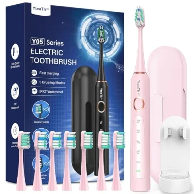 [Deeper Cleaning for Healthier Teeth]: This electric toothbrush pushes the toothpaste to hard-to-reach areas with 50,000 vibrations per minute. 10 times better cleaning than with a manual toothbrush, removes almost 100% of dirt and bacteria and freshening the breath [8 Replacement Brush Heads for 2 Years]: With our sonic toothbrush, you'll receive 8 American DuPont brush heads that last for 24 months. Don't worry about buying brush heads frequently. You can share a toothbrush, and different color bristles can be used to distinguish the toothbrush heads of different family members [Fast Charge & 90 Days Battery Life]: After a charging time of just 3.5 hours, the toothbrush can be used for up to 90 days. It only needs to be recharged four times a year. The YTEATH PRO electric toothbrush is perfect for daily use and longer trips [5 Mode Sonic Electric Toothbrushes]: Sensitive, Clean, Whiten, Polish, Massage. Choose modes to suit your different oral care needs. Cleaning Mode for daily dental care and sensitive mode for fresh user or sensitive teeth [2-minute scientific brushing time]: The electric toothbrush's 2-minute timer is designed according to the brushing time recommended by dentists. It helps you thoroughly clean your teeth and develop proper brushing habits. The 30-second switch indicator reminds users to switch brushing areas to ensure each quadrant is adequately cleaned