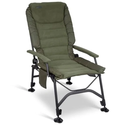 AmazonTransport size 67 x 85 x 22cm Well padded dual density foam mattress Micro fleece mattress and padded armrest covers Multi-point reclining mechanism Ideal for Carp or Coarse Fishing