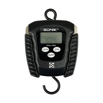 Sonik Digital Folding Scales - Digital scale - Maximum weight: 50kg (110lb) - Accuracy: 10g - Large backlit LCD display - Compact design - Simple Tare weight function - Function for holding the heaviest weight - Automatic power off after 60 seconds - Temperature function - Requires 2 x AAA batteries (not included) The Sonik Digital Folding Scales is a compact digital scale. The scale features a large easy-to-read backlit LCD display, so it is easily visible even in the dark. With a maximum weight of 50kg, you can weigh even the biggest fish. The scale stores the heaviest measured weights and features temperature indication. In addition, the scale has a Tare weight function, which allows you to zero the weight with the weighsling already attached. Turns itself off after 60 seconds for longer battery life.