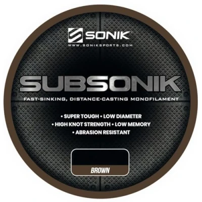 Sonik Subsonik - Super smooth, High Tech monofilament from Sonik - Wide range of variants available - Very high knot strength - Ultra high strength compared to a relatively thin diameter - Minimal stretch characteristics for maximum control during the retrieve - Casts extremely easily and smoothly - Very durable and robust - Unobtrusive, precisely defined colours - Designed for the carp angler who wants the very best - Look no further for the ideal carp line and fish every session with confidence and precision! The Sonik Subsonik is a super smooth, high-tech monofilament nylon line that has been specially designed for the carp angler who wants only the best for his or her fishing. The minimal stretch properties provide maximum control during the retrieve and extremely accurate bite registration, while the high degree of abrasion resistance allows every session to go off without a hitch. When looking for the ultimate line in every respect, look no further!