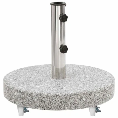 General description This solid granite parasol base provides a firm and sturdy foundation for holding your umbrella, preventing it from tipping over or being blown away. Weighing 30 kg, this umbrella weight plate is extremely stable, ensuring your parasol remains secure even in windy conditions. The umbrella holder features 2 locking bolts to keep the umbrella pole firmly in place. Technical specifications Colour: Grey Material: Granite weight plate + stainless steel tube holder Base diameter: 45 cm Tube height: 29.5 cm Tube external diameter: 57 mm Tube internal diameter: 48 mm Weight: 30 kg Includes adapter for umbrella poles with diameters of 38/48 mm Equipped with 4 castors and 2 locking bolts Compatibility and accessories Includes one adapter for umbrella poles with diameters of 38/48 mm Other information