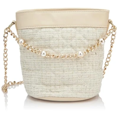 Boucle fabric evening bag Edged with faux leather Gold-coloured link chain with decorative beads Textile interior Zip closure