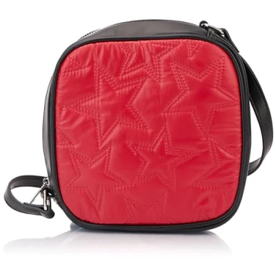 faux leather handbag Debossed stars or plaid pattern Long adjustable shoulder strap Textile interior
