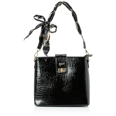 Feminine handbag Made of soft material Gold accents Reptile Embossing Spacious inner compartment