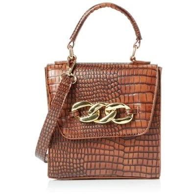 Elegant handbag Made of faux leather with crocodile emboss Shiny gold chain on the flap Short handle Long adjustable shoulder strap