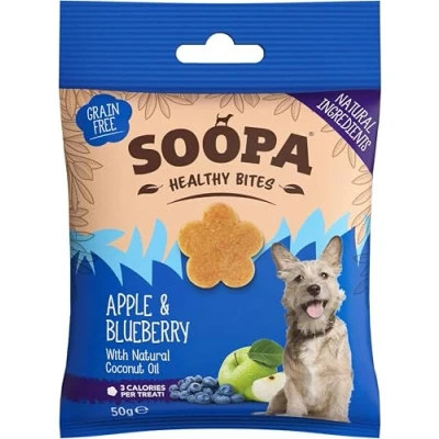 HEALTHY TRAINING TREATS: Our all-natural, bite-sized dog snacks are 100% plant-based, delicious, and perfect for training, rewarding, or simply showing a little love. Suitable for puppies and dogs of all shapes and sizes. HUMAN-GRADE INGREDIENTS: Perfect for pups with sensitive tummies or allergies, Soopa training treats for dogs are easily digestible, and even help fight bad breath! Nothing artificial, just human-grade, vegan goodness, and only 3 calories per bite. APPLE & BLUEBERRY: These tasty mini dog treats have a mighty superpower: immune-boosting apple & blueberry, packed full of fibre, vitamins, and antioxidants to aid digestion, reduce inflammation, and support a healthy diet. Pawfect! GRAIN FREE DOG TREATS: Packaged in a pocket-friendly pouch for walkies, these vet-approved, grain-free, low-fat, low-calorie, hypoallergenic, additive-free, yummy snacks are made with limited, all-natural ingredients (and plenty of love). SOOPA PETS: An eco-conscious, female-led Irish company, Soopa makes healthy, vegan, dog and puppy treats and chews from superfood ingredients, produced to human-grade standards. Simple, delicious, and nutritious. And the best bit? Dogs love them.