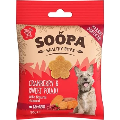 HEALTHY TRAINING TREATS: Our all-natural, bite-sized dog snacks are 100% plant-based, delicious, and perfect for training, rewarding, or simply showing a little love. Suitable for puppies and dogs of all shapes and sizes. HUMAN-GRADE INGREDIENTS: Perfect for pups with sensitive tummies or allergies, Soopa training treats for dogs are easily digestible, and even help fight bad breath! Nothing artificial, just human-grade, vegan goodness, and only 3 calories per bite. CRANBERRY & SWEET POTATO: Immune-boosting cranberries, bursting with vitamins and antioxidants -- these mini dog treats are suitable for pups with weight Issues, diabetes, allergies, pancreatitis, CKD stage 1 & 2, liver disease, IBS & low immunity. GRAIN FREE DOG TREATS: Packaged in a pocket-friendly pouch for walkies, these vet-approved, grain-free, low-fat, low-calorie, hypoallergenic, additive-free, yummy snacks are made with limited, all-natural ingredients (and plenty of love). SOOPA PETS: An eco-conscious, female-led Irish company, Soopa makes healthy, vegan, dog and puppy treats and chews from superfood ingredients, produced to human-grade standards. Simple, delicious, and nutritious. And the best bit? Dogs love them.