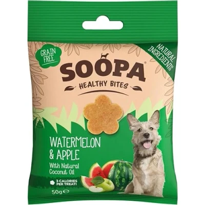 HEALTHY TRAINING TREATS: Our all-natural, bite-sized dog snacks are 100% plant-based, delicious, and perfect for training, rewarding, or simply showing a little love. Suitable for puppies and dogs of all shapes and sizes. HUMAN-GRADE INGREDIENTS: Perfect for pups with sensitive tummies or allergies, Soopa training treats for dogs are easily digestible, and even help fight bad breath! Nothing artificial, just human-grade, vegan goodness, and only 3 calories per bite. WATERMELON & APPLE: Vitamin-rich antioxidant watermelon with coconut oil MCTs to support cognitive function – these mini dog treats are suitable for pups with weight issues, diabetes, pancreatitis, CKD stages 1 & 2, liver disease, IBS & low immunity. GRAIN FREE DOG TREATS: Packaged in a pocket-friendly pouch for walkies, these vet-approved, grain-free, low-fat, low-calorie, hypoallergenic, additive-free, yummy snacks are made with limited, all-natural ingredients (and plenty of love). SOOPA PETS: An eco-conscious, female-led Irish company, Soopa makes healthy, vegan, dog and puppy treats and chews from superfood ingredients, produced to human-grade standards. Simple, delicious, and nutritious. And the best bit? Dogs love them.