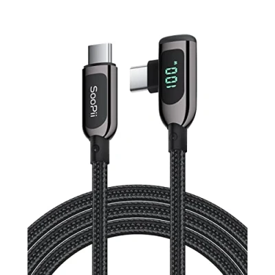 【User-friendly Right Angle Cable】With considerate 90 degrees right angle design, easy to play games, watch videos and read e-Books while charging comfortably. 【Smart LED Display】Real-time charging power visible, show charging status and signify high power process. Built-in smart chips monitoring the charging power and adjusting current and voltage automatically, avoiding damage to the battery in case of unstable current.(Please note display module just show charging power, it neither increase nor decrease charging current.) 【100W High-Speed Charging】Supports up to 100W(20V 5A) charging speed,with a max output of 100W charger, SooPii USB C to USB C cable can charge any Type-C devices from phones to laptops. Pair with a 100W USB-C Power Delivery charger to power up a MacBook Pro 16ʺ in 2 hours. (NOTE: This is a data transfer and USB 2.0 version charging cable, and does not support video output.) 【Ultimate Durability】 Based on 36,000+ bends strict tests, with special zinc alloy design and wearing rugged nylon braided exterior, SooPii Type-C Charging cable designed for longer service life and will never rupture. 【Widely Compatibility】Works effortlessly with any USB-C device including phones, tablets, and laptops. Compatible with lphone 15, MacBook Pro 13'', MacBook Pro 15'', MacBook Air 2018, iPad Air 2020 10.9” (4th generation), iPad Pro 12.9''/11'', Galaxy S21/ S21 Ultra/ S20/ S20+/ S20 Ultra/ Note 10/ Note 10 Plus/ , Google Pixel 2/3/3a/4 XL, Switch/Switch Lite and more. (Note: Please use a 100W USB-C wall charger to achieve fast charging. ) 【What you Get in Box】1 x SooPii S40CC 3in1 Fast Charging Cable and SooPii Worry-free 24-month Warranty and Our Lifetime Meticulous Service for any Problems,Concerns, Troubleshoots.