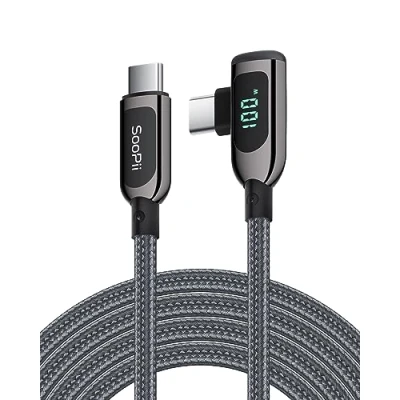 【User-friendly Right Angle Cable】With considerate 90 degrees right angle design, easy to play games, watch videos and read e-Books while charging comfortably. 【Smart LED Display】Real-time charging power visible, show charging status and signify high power process. Built-in smart chips monitoring the charging power and adjusting current and voltage automatically, avoiding damage to the battery in case of unstable current.(Please note display module just show charging power, it neither increase nor decrease charging current.) 【100W High-Speed Charging】Supports up to 100W(20V 5A) charging speed,with a max output of 100W charger, SooPii USB C to USB C cable can charge any Type-C devices from phones to laptops. Pair with a 100W USB-C Power Delivery charger to power up a MacBook Pro 16ʺ in 2 hours. (NOTE: This is a data transfer and USB 2.0 version charging cable, and does not support video output.) 【Ultimate Durability】 Based on 36,000+ bends strict tests, with special zinc alloy design and wearing rugged nylon braided exterior, SooPii Type-C Charging cable designed for longer service life and will never rupture. 【Widely Compatibility】Works effortlessly with any USB-C device including phones, tablets, and laptops. Compatible with lphone 15, MacBook Pro 13'', MacBook Pro 15'', MacBook Air 2018, iPad Air 2020 10.9” (4th generation), iPad Pro 12.9''/11'', Galaxy S21/ S21 Ultra/ S20/ S20+/ S20 Ultra/ Note 10/ Note 10 Plus/ , Google Pixel 2/3/3a/4 XL, Switch/Switch Lite and more. (Note: Please use a 100W USB-C wall charger to achieve fast charging. ) 【What you Get in Box】1 x SooPii S40CC 3in1 Fast Charging Cable and SooPii Worry-free 24-month Warranty and Our Lifetime Meticulous Service for any Problems,Concerns, Troubleshoots.