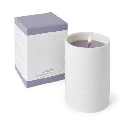 The Sophie Conran By Wax Lyrical Ceramic Candle Jar Wisdom has been designed to restore a sense of equilibrium in both its elegant look and beautiful fragrance.With bright and herbal top notes of clary sage that lead to a powdery heart of violet, while sweet notes of iris rest on a woody base of patchouli and frankincense.Beautifully presented calming blue wax candle in a white rippled ceramic jar. Designed and manufactured in England.Burn time up to 80 hours.