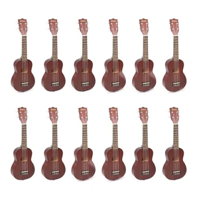 Soprano ukuleles designed for the classroom 12 pack of ukuleles with carry cases Tie bar bridge for easy string replacement Geared machine heads for accurate tuning Nylon strings – gentle on the fingertips
