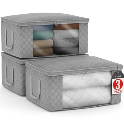 FABRIC STORAGE ORGANIZER BAGS (1 SECTION, 3-PACK, GRAY) - Store and protect clothing and household items with convenient organizer bags - Features 3 divided sections with a clear window view for easy access LIGHTWEIGHT & PORTABLE - Carry handles lift bags for stacking or transporting from place- to-place- Easily move to shelves, closets, etc - Quickly pack/unpack between seasons, traveling, moving, or as needed FOLDABLE & ZIPS CLOSE - Fold away or collapse flat under bed or in drawers when not in use - Zipper closure protects against dust, pest, water damage, and smell CLEAR WINDOW PANEL DESIGN - Made of Polypropylene Nonwoven - Large transparent front window, zipper closure,2 handles - Measures approximately 19" L X 14" W X 8" H International products have separate terms, are sold from abroad and may differ from local products, including fit, age ratings, and language of product, labeling or instructions.