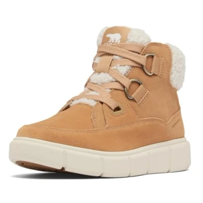 PREMIUM WATERPROOF BOOTS: Women’s boots with waterproof suede upper, faux shearling tongue and collar, and robust laces for outdoor style SUPREME COMFORT & SUPPORT: Sculpted EVA, plush microfleece lining, LIVELYFOAM cushioning, 100g insulation, and enhanced ankle support HOW TO STEP OUT IN STYLE: Wear for hiking, city outings, or winter adventures—premium hardware and fashion-forward flai DURABLE MATERIALS & CARE: Waterproof bootie design, moulded rubber pods, EVA perimeter for grip; wipe clean, air dry CONTENTS: 1x Sorel Explorer III NW Lace WP Boots, Women's, Size: 4 UK, Colour: Tawny Buff, Sea Salt
