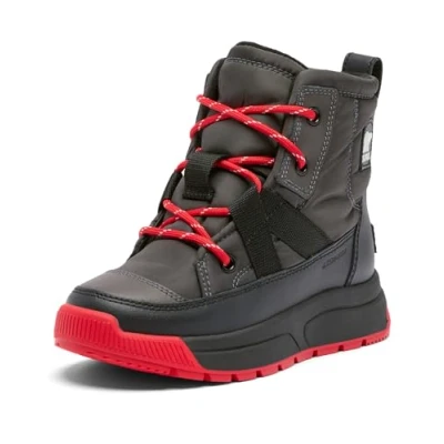 WATERPROOF WINTER BOOTS: Youth unisex boots with waterproof nylon upper, PU-coated accents, and microfleece interior for outdoor adventures COSY & SECURE FIT: Detachable plush EVA footbed, microfleece lining, 200g insulation, sculpted rubber, and nylon heel pull tab HOW TO EXPLORE WITH CONFIDENCE: How to: Wear for trail hikes, city outings, or winter play—robust design for all-day comfort DURABLE MATERIALS & CARE: Waterproof bootie, moulded rubber outsole, superior grip; wipe clean, air dry CONTENTS: 1x Sorel Youth Whitney III Mid WP Boots—waterproof, insulated, detachable footbed, Youth Unisex, Size: 13 UK, Colour: Jet, Black