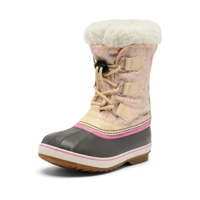 WATERPROOF WINTER BOOTS: Youth unisex boots with waterproof nylon upper, seam-sealed design, and snug insulation for outdoor adventures COSY & EASY FIT: Removable 9mm washable felt inner boot, sherpa pile snow cuff, toggled laces, and ankle support for effortless wear HOW TO EXPLORE WITH CONFIDENCE: How to: Wear for rain, snow, trail, or city—signature Sorel style for winter adventures DURABLE MATERIALS & CARE: Vulcanised rubber shell, Aero-Trac non-loading outsole, 2.5mm bonded felt frost plug; wipe clean, air dry CONTENTS: 1x Sorel Children's YOOT PAC Nylon WP Boots—detachable liner, waterproof, Youth Unisex Little, Size: 8 UK, Colour: Honey White, Orchid