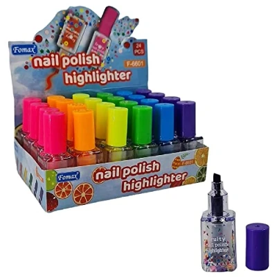 Display of 24 Fluorescent Markers with nail polish shape. Contains 24 pieces in 6 assorted colors.