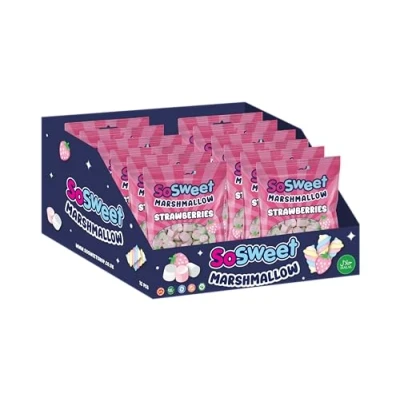 Fluffy & Fruity Delight: Enjoy the soft, pillowy texture of SoSweet Marshmallow Strawberries, bursting with natural strawberry flavour in every bite Perfect for All Occasions: Whether you’re snacking on them straight from the bag, topping desserts, or adding a fruity twist to your hot chocolate, these marshmallows are versatile and fun Light & Airy Texture: Each marshmallow is crafted to perfection, with a light, fluffy texture that melts in your mouth – making it an irresistible treat for all ages Part of the SoSweet Marshmallow Range: Explore more delicious marshmallow treats from SoSweet, including Marshmallow Twists and the classic Pink & White Marshmallow Bag Perfect for Gifting or Sharing: The 140g bag is perfect for parties, sweet tables, or as a fun gift for marshmallow lovers of all ages