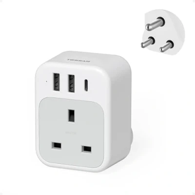 South Africa Power Adapter: Type M plug adapter is compatible in several countries, such as South Africa, Namibia, Botswana, India, Nepal, Mozambique, Sri Lanka, Eswatini, Lesotho, etc 4 in 1 Travel Plug: The South African plug adaptor can be expanded to 1 outlet, 1 USB C and 2 USB A; The plug can charge 4 devices simultaneously; Travel plug for south africa gives you more charging options USB C Adapter Plug: The travel adapter South Africa is equipped with both USB A and USB C ports; The USB C output is 15 W Max and the USB A output 12 W Max; They are suitable for charging mobile phones, tablets and other devices Compact and Portable: Travel plug South Africa measures 7.3 x 5.6 x 4 cm and weighs 106 g; The UK to South Africa adapter fits easily in your travel bag and does not take up much space in your luggage; Suitable for travel, business trips, etc Warm Tips: The plug for South Africa is not a voltage converter; make sure your device has an input voltage range of 100 to 250 V and the maximum power of the Namibia travel plug is 2500 W, Weight: 0.220462262 Pounds, Manufacturer: Zhuhai Tessan Power Technology Co., Ltd.