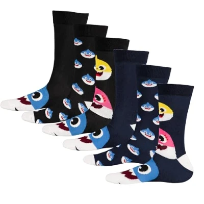 Cotton Rich Socks by Soxy, Featuring Shark Designs of Shark Family Members, perfect gift for Shark fans Each 6 Pack Contains 3 Designs as per images, The Mens design has a Blue Shark, Ladies design has a Pink Shark and a yellow shark in the Kids Design. 80% Cotton, 17% Polyester, 3% Spandex Available in UK Sizes 6-11 (EU 39-45), 4-6 (EU 37-39), UK 12-3 (EU 31-36), UK 9-12 (EU 27-30) and UK 6-8 (EU 23-26) Adults and Matching Mini Me Kids Sizes, so the whole family can wear them! Great Gift Idea for Shark Fans of All Ages