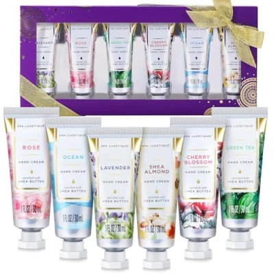 Spa Luxetique Hand Cream Gift Set Hand Cream Lotion For Dry Hands Travel Moisturizing Hand Lotion With Natural Aloe Vitamin E Best Gift Set For Women 6 X 1.0 Oz 30Ml Ultra-Nourishing Hand Cream: This rich, deeply hydrating and moisturizing hand cream leaves hands silky-soft, smooth and rejuvenated. Non-greasy formula absorbs quickly and feels comfortable all day Travel-Friendly: Perfect "on-the-go" size for your purse and hand bag. 6 x 1 oz (30ml) volume is easy to carry and store 6 Pleasant Fragrances: Cherry Blossom, Lavender, Green Tea, Shea Almond, Rose, Ocean. Pick and choose your favorite scent based on your mood at the moment from our 6 natural fragrances Perfect Gift Set for All Occasions - Our exquisite packaging and premium products are perfect as a gift for yourself or a loved one. Great for Mother's Day, Valentine's Day, Anniversary, Birthday, Christmas Presents or for no reason at all