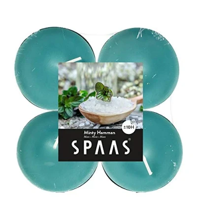 Benefits: quality paraffin, packed per 12 Maxi tea lights Scent: Minty Hammam - The minty aroma is both purifying and invigorating. It is the perfect scent to create some magnificent me time. Imagine you’re at a spa with these hammam scented candles. Burn time: ± 10 hours, enjoy a carefree evening with the long burning time of 10 hours Quality: Spaas' candles are carefully made conform the highest quality standards. We find it important to make products that do what they are promised to do, with safety.