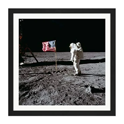 Space NASA Apollo 11 Aldrin Salutes US Flag Moon Photo Square Wooden Framed Wall Art Print Picture 16X16 Inch