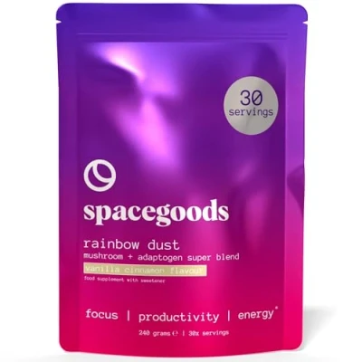 COFFEE, BUT BETTER - Spacegoods is a healthy, alternative to regular coffee. It’s everything you love about coffee with none of the jitters & crashes. Consume 2-3 servings per day. GREAT TASTE - Enjoy the benefits without the bitter aftertaste. Rainbow Dust is carefully crafted to offer truly delicious flavours, simple to mix with milk or water. Unlike many mushroom supplements that can have a strong, earthy or bitter taste, we pride ourselves on innovating a formula which has been expertly blended for a taste you actually look forward to! QUALITY INGREDIENTS - Rainbow Dust contains a range of functional ingredients. Lion's Mane mushroom has been traditionally used in Far East Asia. Chaga mushroom is known to many as the “king of mushrooms”, containing antioxidant properties. Ashwagandha is an adaptogen that is known to help combat stress and has been shown to induce a calming effect. HOW TO USE - Rainbow Dust is super versatile and convenient. You can drink it either with water or milk (enjoy either hot or cold) as a coffee alternative. Scoop 8g of Rainbow Dust. Mix using your frother to blend to perfection. Drink & enjoy focus, energy or just feeling calm. SPACEGOODS – Spacegoods Founder Matt's journey began with a simple mission: to create a product that would help people feel and perform their best every day - just wanting to reach that true flow state - focus, energy & calm. This is how Spacegoods was born, with a product and a message that stands out from the vanilla copycats that dominate the wellness space today and goes against the grain.