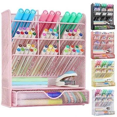 Unique Spatial Structure: This desk organizer has 10 compartments and 1 drawer, spacious storage space and compartment design, can make your belongings organized in an orderly manner, find items at your fingertips, bid farewell to the messy desktop. Convenient And Practical: No installation required. The pink pen holder adopts the arc line structure, which is more stable and durable and not easy to deform. The smooth corners and edges are not easy to scratch. It is practical and beautiful. It is very suitable for you to organize stationary supplies such as pencils, memo or cosmetics. Exquisite and Beautiful: The combination of pink mesh structure and metal lines makes this marker organizer unique artistic beauty, which can perfectly decorate your desktop, practical and beautiful, very suitable as a creative gift for relatives and friends. Improve Your Work Efficiency: A stylish pen organizer can keep the desk tidy, make storage and search easier and more convenient; The exquisite appearance and practical functions can be easily coordinated with other desktop products, bringing more fun to your study and work. Service Concept: We are committed to creating exquisite, fashionable and practical office supplies for customers, so that you can feel the fun of studying and working. We provide a 30-day return policy. If you have any questions, please contact us immediately.