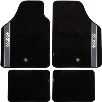 Durable and aesthetic Sparco Floor Mat to keep your car clean 450 g black carpet car mat 4 pieces/set, two front mats with SPARCO logo Front mats with a hole for screw insertion to secure rug Suitable for all cars with or without clutch