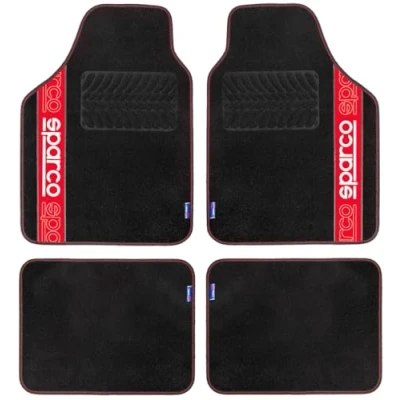 Complete set of 4 Sparco model 510 carpet mats. Manufactured in polyester to the highest quality standards. With embossed tyre print on the side sills. Sporty design with Sparco logo on the sides. Universal, suitable for all cars with or without floor accelerator. With built-in anti-slip technology. Front dimensions 66 x 47 cm, rear dimensions 37 x 47 cm.