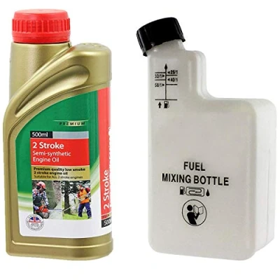 2 Stroke Semi Synthetic Engine Oil + Fuel Mixing Bottle made for SPARES2GO Fits Models: Suitable for products that require 2 Stroke Semi Synthetic Oil Product Specifications: Provides a high level of film strength and anti-wear performance therefore prolonging engine life -- Prevents ring sticking and spark plug fouling -- Mix at 40:1 or 50:1 ratio Fuel Mixing Bottle labelled with an accurate mix for 25:1, 32:1, 40:1, and 50:1 ratios Premium Quality Semi Synthetic Oil
