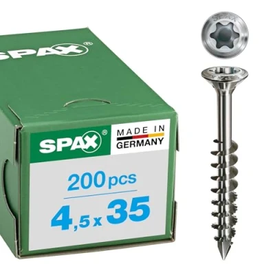 Use: for visible and invisible screwing of façade woods in outdoor areas, e.g. floor cover formwork. High corrosion resistance thanks to stainless steel A2 Raised countersunk head for aesthetic look and clean countersinking thanks to milling ribs. Optimum power transmission and clean fit with SPAX bit T-Star plus T20 with guide pins Effortless work and longer battery life: no pre-drilling (depending on the wood). Precise attachment and reduction of the splicing effect thanks to the drilling function of the CUT tip. Easier cutting of the wood fibre thanks to Spax-typical wave profile Made in Germany: TÜV certified. Approved by building authorities: European technical approval for screws as wood fasteners in load-bearing wooden constructions (ETA-12/0114) Box contents: 1 SPAX box, pack of 200 facade screws, T-Star plus, raised countersunk head, partial thread, cut tip, stainless steel A2, material quality: 1.4567, thread diameter (Ød1) = 4.5 mm x total length (Ls) = 35 mm, partial thread length (LgT) = 25 mm, head diameter (Ødk): 8.8 mm, bit not included included, Weight: 1.3889122506 Pounds, Manufacturer: SPAX International GmbH & Co. KG