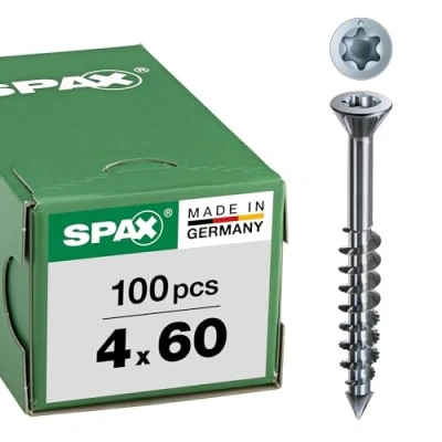 Use: for screwing MDF materials and other thin-walled panels made of wood materials indoors. Spax exclusive Wirox surface Countersunk head with milling ribs pulls particularly easily into the material and can be recessed flush. Optimum power transmission and clean fit with SPAX bit T-Star plus T20 with guide pins Effortless work and longer battery life: no pre-drilling (depending on the wood). Precise attachment and reduction of the splicing effect thanks to the drilling function of the CUT tip. Easier cutting of the wood fibre thanks to Spax-typical wave profile Made in Germany: TÜV certified. Approved by building authorities: European technical approval for screws as wood fasteners in load-bearing wooden constructions (ETA-12/0114) Box contents: 1 Spax-M box, 100 pieces MDF screw, T-Star plus countersunk head, 75° milling head, partial thread, cut tip, WIROX surface, thread diameter (Ød1) = 4 mm x total length (Ls) = 60 mm, partial thread length (LgT) = 40 mm, head diameter (Ødk): 7 mm, bit not included, Weight: 0.761917577472 Pounds, Manufacturer: SPAX International GmbH & Co. KG