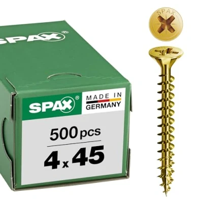Use: universal Exclusive Yellox coating from SPAX: improved resistance to corrosion, more environmentally-friendly than the usual yellow zinc plating as it is chrome-free (VI) Multicountersunk head for easy penetration into the material and simplified screwing Screws into wood and stops at metal Maximum transmission of power and better grip on the crossshaped head Save energy and batteries: no pilot hole needed (depending on the wood) Reduces splitting wood thanks to the 4CUT 4sided tip Typical SPAX serrated profile for separating wood fibres more easily Made in Germany: TUV certified Officially licensed: European technical approval for selftapping screws as objects for wood assembly (ETA12/114) Contents: 1 SPAX box, countersunk head, full thread, 4 cut tip, Yellox coating, cap not included, Weight: 2.6675933702 Pounds, Manufacturer: Spax