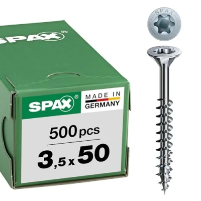 For universal indoor and outdoor use without direct weathering. Spax-exclusive Wirox surface: 20x more corrosion protection compared to conventional bare zinc plating as required by standard. As a multi-head pronounced countersunk head for flush penetration and comfortable processing, milled in wood, brakes on metal. Optimum power transmission and clean fit even when processing overhead with Spax bit T-Star plus T20 with guide pins (gradual conversion from T15 to T20) Box contents: 1 Spax box, 500 pieces universal screw, T-Star plus, countersunk head, partial thread, 4CUT, WIROX surface, thread diameter (d1) = 3.5 mm x total length (Ls) = 50 mm, part Thread length (LgT) = 32 mm, head diameter (Dk): 7 mm, bit not included International products have separate terms, are sold from abroad and may differ from local products, including fit, age ratings, and language of product, labeling or instructions., Weight: 2.3368999772 Pounds, Manufacturer: Spax