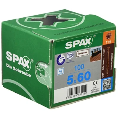 Use: outdoor use when building terraces. High corrosion resistance thanks to stainless steel A2. Antique brownish colourway Small cylinder head: easy countersinking with reduced splitting effect. Fixing thread for firm and permanent connection of two woods, reduces creaking noise. Optimum power transmission and clean fit with SPAX bit T-Star plus T25 Effortless work and longer battery life: Precise attachment and reduction of the splicing effect thanks to the drilling function of the CUT tip with sharp, spear-like shape. Pre-drilling is recommended for hardwoods Made in Germany: TÜV certified. Approved by building authorities: European technical approval for screws as wood fasteners in load-bearing wooden constructions (ETA-12/0114) Box contents: 1 SPAX box, pack of 100 terrace screws T-Star plus, cylinder head, fixing thread, cut tip, stainless steel A2, material quality: 1.4567, colour: antique, thread diameter (Ød1) = 5 mm x total length (Ls) = 60 mm, partial thread length (LgT) = 26 mm, head diameter (Ødk): 7 mm, bit not included, Manufacturer: SPAX
