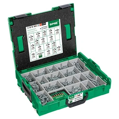 L-Boxx: robust mounting case with 16 dimensions, clearly and clearly sorted in sturdy and proven original L-Boxx in green, including SPAX BitBox Exclusive Wirox A9J coating: offers higher corrosion protection, higher surface hardness and is more environmentally friendly (chrome (VI) free) than conventional bare zinc plating. Can be used indoors and protected outdoors. Easy, quick and secure screwing: thanks to the perfect fit and optimal power transmission of the bit. With the T-Star plus power attack, work is also possible overhead. Energy-saving work: thanks to the 4CUT tip, pre-drilling is usually unnecessary and the splitting effect is reduced. The wave-shaped thread of the SPAX allows quick and secure screwing and saves battery power. Flush countersinking of the screws: with its polygonal bottom ("pockets"), the countersunk head mills itself into the wood or is braked when placed on metal to prevent over-tightening or damage to fittings., Weight: 0.8377565956 Pounds, Manufacturer: SPAX International
